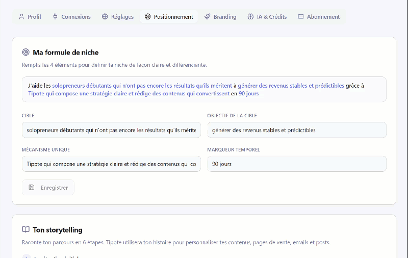 Tipote est un outil d'IA conçu pour les solopreneurs, coachs, créateurs de contenu et freelances francophones. Il mémorise ton business, génère ta stratégie personnalisée, crée tes contenus dans ton style, programme tes publications, construit tes pages de vente — et se connecte à Systeme.io.