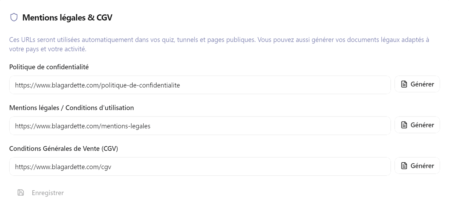 Si tu ne possèdes pas encore ces pages, clique sur "générer" et entre les informations de base pour que Tipote te livre tes pages légales en PDF.