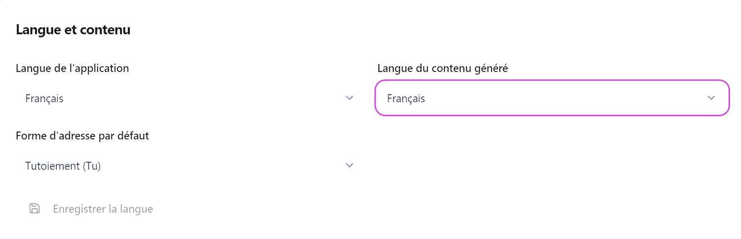 Choisis simplement la langue dans laquelle tu souhaites générer tout ton contenu. Idéal si tu bosses sur un projet dans un pays qui n'est pas francophone.